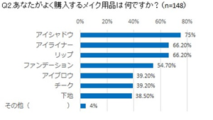 62.8%が月に1回以上と回答。11.5%が週に1回以上という結果から、10人に1人は毎週コスメ購入者であることがわかりました。 またよく購入するアイテムは、「アイシャドウ(75%)」「アイライナー(66.2%)」「リップ(66.2%) 」がトップ3に。気軽に印象を変えられるアイメイクが人気となりました。