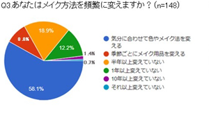 あなたはメイク方法を頻繁に変えますか?という質問に対し、58.1%が季節に合わせてメイク法を変えると回答しましたが、12.2%が1年以上メイク方法を変えていないことが判明しました。