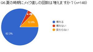 夏の汗ばむこの季節、夏の時期にメイク直しの回数は増えますか?と質問したところ、82.3%が「増える」と回答。夏にメイクで困ることはなんですか?という質問では、「アイメイク」「てかり」「よれ」に対する悩みが多く見られました。