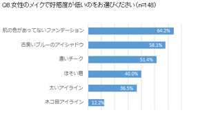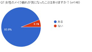 女性のメイク崩れが気になったことはありますか?と聞いたとこと、93.9%の方がはいと回答。また、同性のメイクで好感度の低いメイクは「肌の色があってないファンデーション(64.2%)」「ブルーのアイシャドウ(58.1%)」と続きました。自分のメイク崩れの失敗談でも、「マスカラとアイライナーが下まぶたに付いて、パンダ目になっていた事。「フィルムタイプのマスカラやアイライナーがポロポロ顔についていた」など、ファンデーションのヨレなどよりもアイメイクの失敗談が多く集まりました。