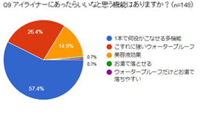 アイライナーにあったらいいなと思う機能はありますか?と質問したところ、57.4%が一本で何役かこなせる多機能と回答。またお湯で落とせると回答した方は1%に満たず、 オフの手軽さより、パンダ目になりずらいウォータープルーフタイプが人気なことがわかりました。