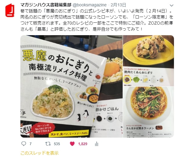 2月14日に発売された悪魔のおにぎり公式レシピ本、悪魔のおにぎりと南極流リメイク料理。リリースの噂が広まるや、ツイッターでも瞬く間に「いいね!」が飛び乱れ、Amazonの売上ランキング1位の座になりました(酒肴・おつまみ 部門)。