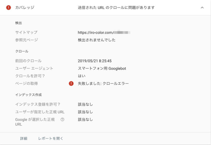 サーチコンソールでのインデックス登録でもクロールエラーは出なくなって登録できるようになっている。